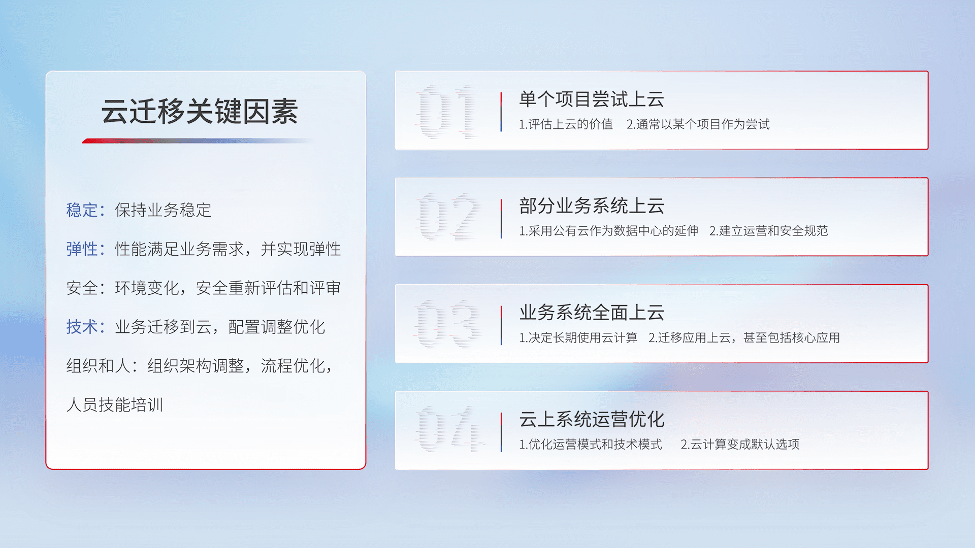 结合实际业务,,,从规划设计、、、云平台选型、、云原生改造、、、、数据迁移、、、、集成交付,,迁移全过程为客户识别最佳上云路径,,做好风险识别管理,,,,设计网络架构、、、、身份权限、、、、安全审计合规、、、、操作审计、、日志审计、、、、监控告警策略、、、多站点容灾设计等,,,,对云上基础设施进行整体规划,,,,提升IT治理水平,,,以满足弹性、、、、高可用、、、高性能的需求。。。