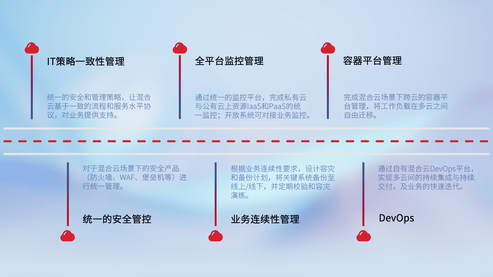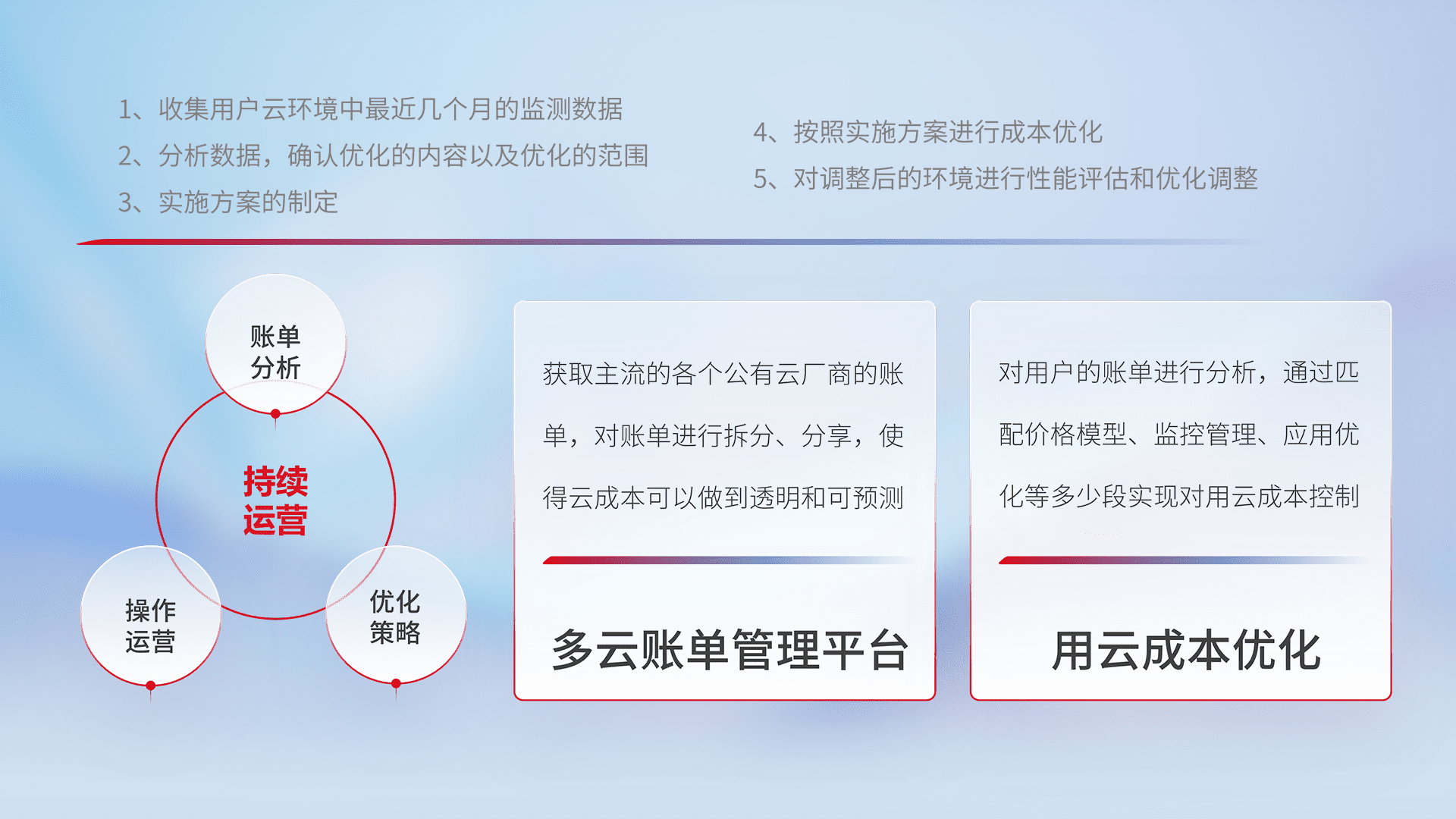 通过多云纳管,,,,以统一的资源数据模型把客户的云资源进行抽象和封装,,,,进而实现对多云资源的统一操作,,,保障云资源管理的可靠性、、、稳定性与可用性。。。量身定制化运维内容,,,配置、、、开发运维、、、、补丁管理、、备份、、监控、、认证和访问管理、、审计和日常巡检等,,保障在用云过程中的可靠度,,稳定度以及高可用率。。