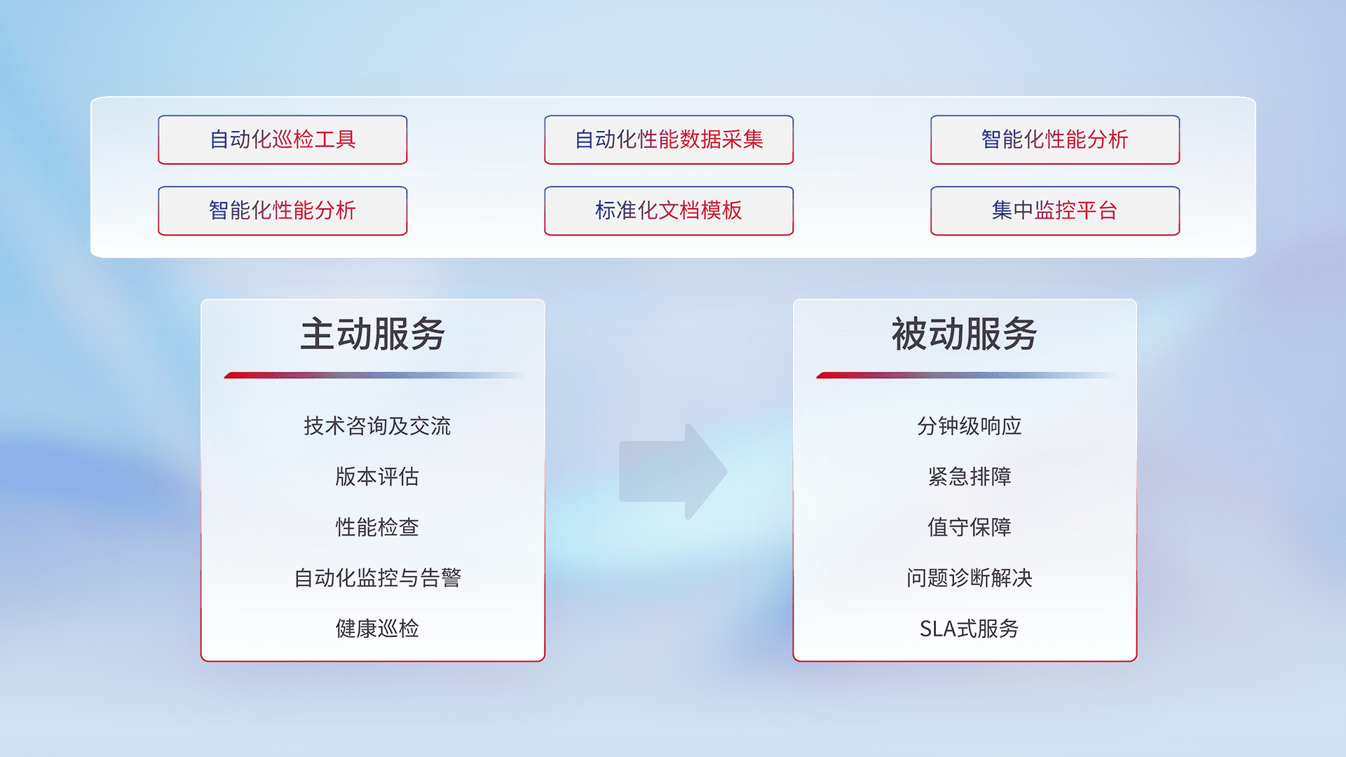 智能化工具和标准化文档,,,保障服务质量,,,,提供主动服务(包含技术咨询、、版本评估、、、、性能检查、、、自动化监控与告警、、健康巡检)和被动服务包含(分钟级响应、、、、紧急排障、、、、值守保障、、问题诊断解决、、、、SLA服务)。。。
