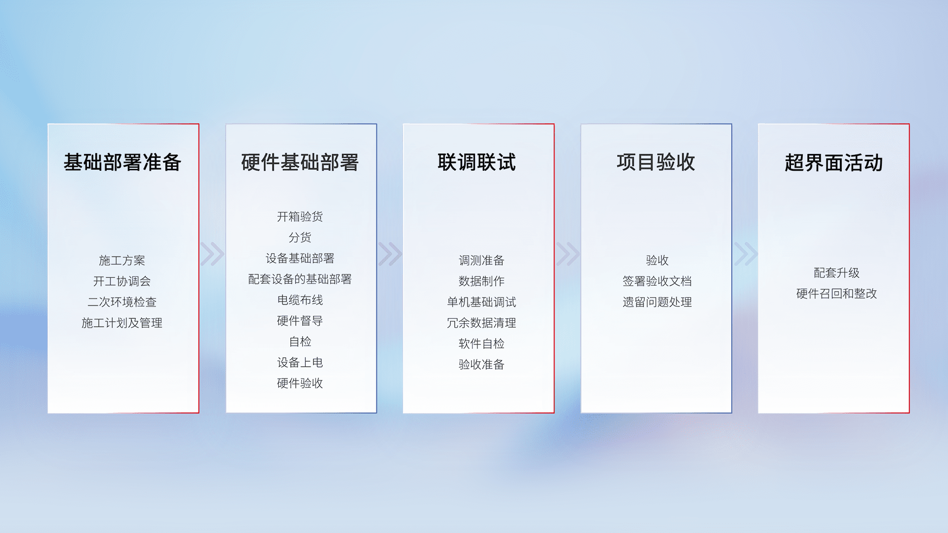 从基础部署准备、、、硬件基础部署、、联调联试、、、项目验收、、、越界面活动的全过程可追溯,,,,保证施工质量和进度。。。